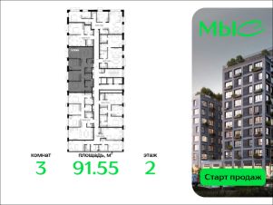 Старт продаж!В продаже квартира площадью 91.55 кв. м без отделки на 2 этаже 12 этажного дома. Квартира находится в премиальном жилом комплексе ''МЫС'' (Застройщик - MR Group).ЖК ''МЫС'' - идеальное место для тех, кто хочет объединить городскую жизнь с близостью к природе. Здесь каждый найдет формат жилья на свой вкус: многоквартирные и клубные дома для больших семей, ценящих приватность и простор, частные дома и таунхаусы для истинных фанатов загородной жизни, которые не готовы отказываться от городского комфорта. Расположение- 2 мин. до скоростной трассы М1 и Минского шоссе,- 10 мин. до МКАД,- 20 мин. до делового центра ''Москва-Сити'',- 25 мин. до ст. метро ''Рассказовка'',- 28 мин. до аэропорта ''Внуково''.Благоустройство- авторские лобби,- уютные зоны ожидания и библиотека,- велосипедные и лыжные маршруты,- собственная набережная и парк,- лаунж-зоны в окружении природы,- беседки у очага,- дворец спорта площадью 20 000 кв. м,- термальный комплекс с тремя бассейнами,- 4 теннисных и падел-корта,- 6 сквош-кортов,- многофункциональный спортзал,- скейт-парк,- просторная площадь для прогулок с фонтаном,- детский клуб с творческими секциями,- гастро-доминанта,- кафе у пруда, рестораны, ритейл.Окружение- соседство с лесным фондом,- школа на 1250 мест и 2 детских сада на 350 и 255 мест,- резерват ''Долина реки Вяземки'', Дубковский и Подушкинский леса, парк ''Рассказовка'', Мещерский парк.