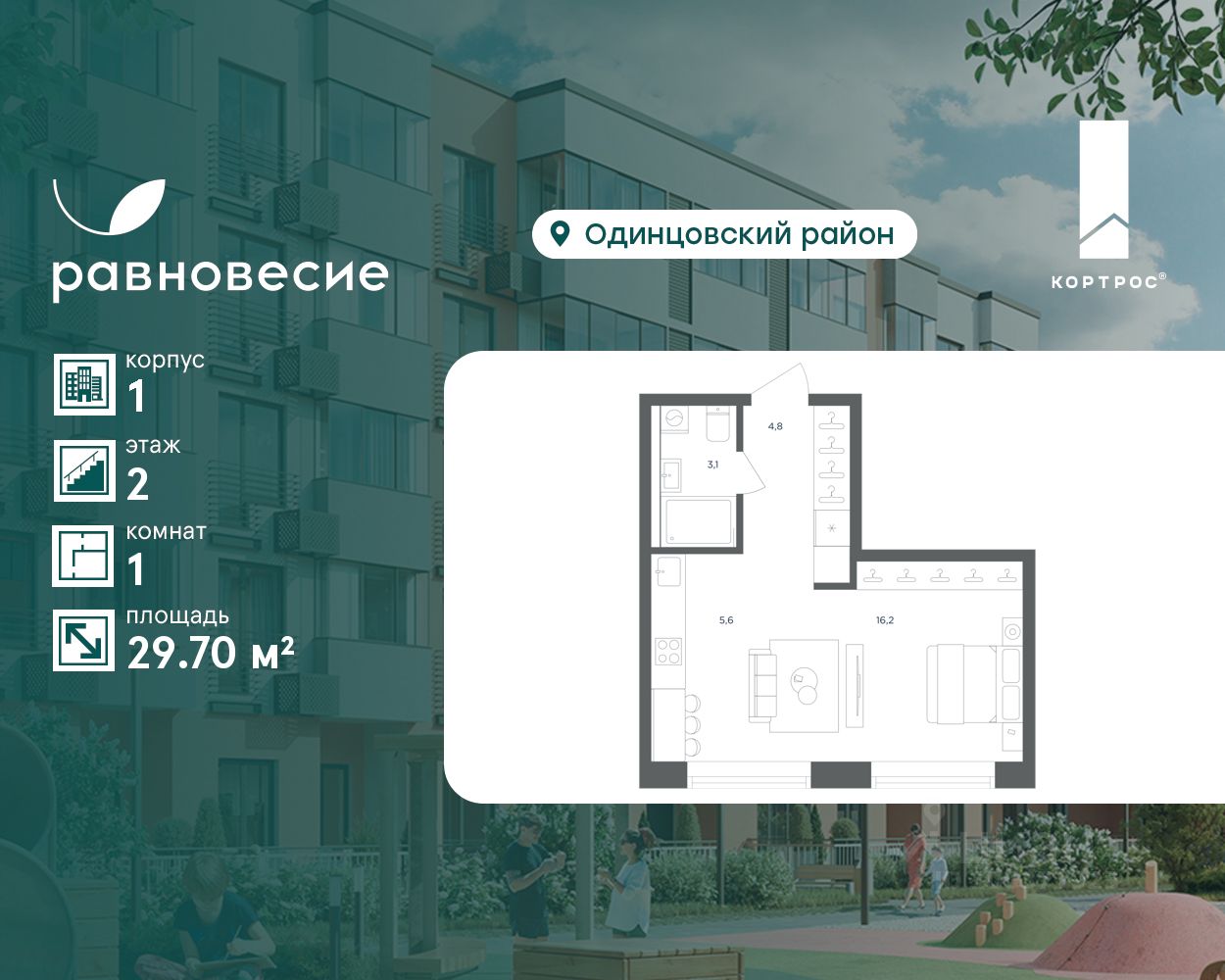 Продаётся квартира-студия общей площадью 29.70 кв. метров на 2 этаже жилого квартала комфорт-класса ''Равновесие''.