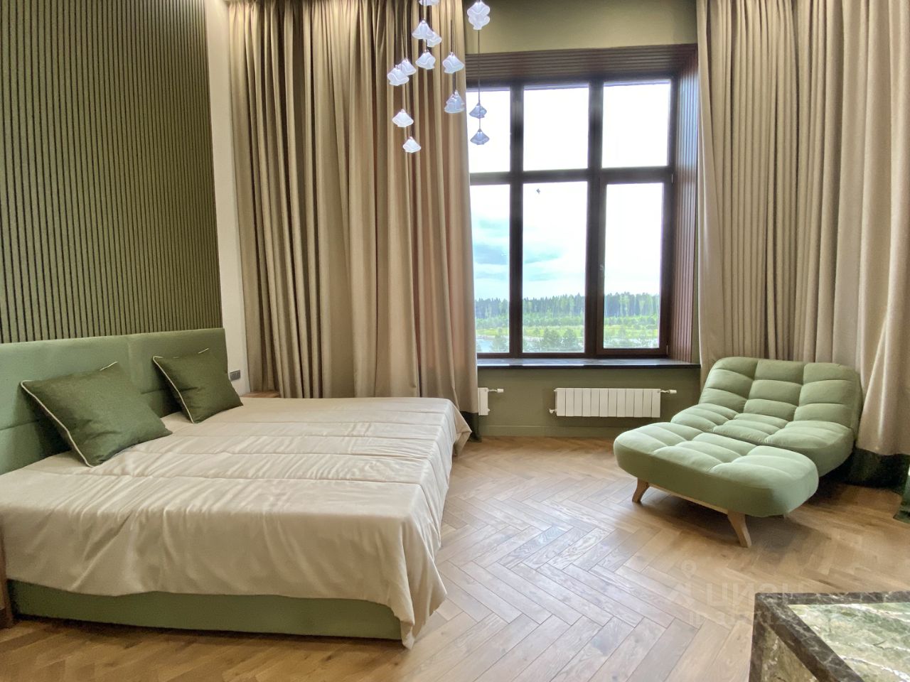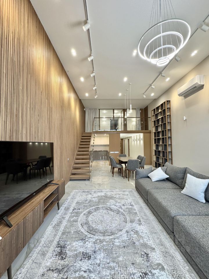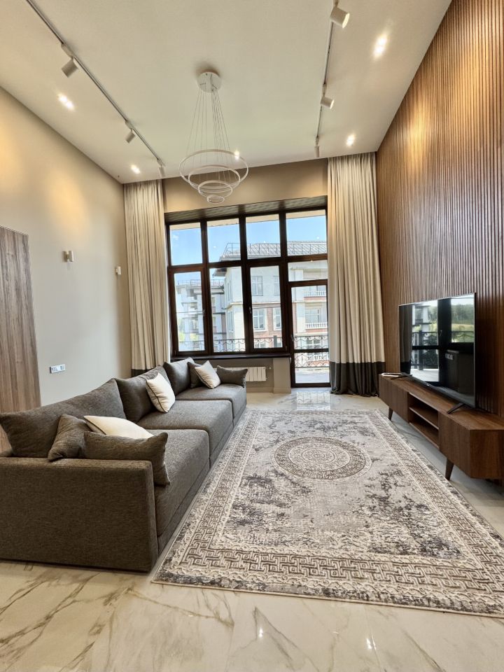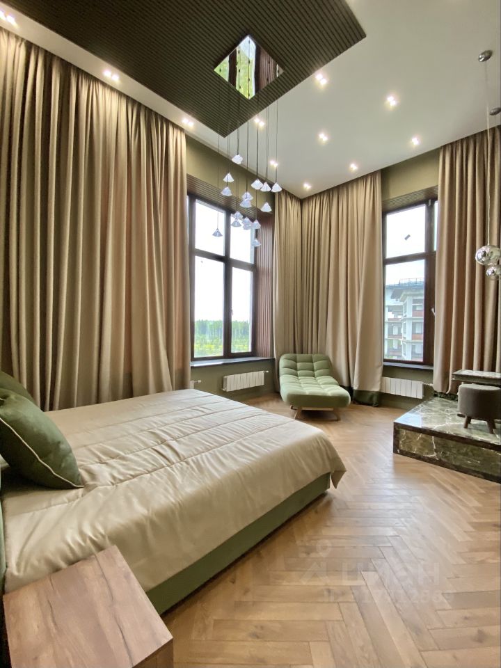 Квартира полностью укомплектована качественной мебелью и техникой. По планировке: просторная гостиная, столовая с потолком более 4,6 метров и выходом на лоджию 15 метров откуда открывается прекрасный вид на парковую зону поселка, кухня, при входе просторная полностью оборудованная гардеробная комната и полноценный санузел, постирочная комната. Мастер спальня с 2 окнами и прекрасными видами, гардеробная с окном, полноценный санузел. На втором уровне 2 полноценные спальни с гардеробными комнатами, санузел.