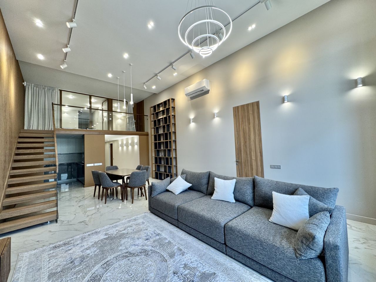Квартира полностью укомплектована качественной мебелью и техникой. По планировке: просторная гостиная, столовая с потолком более 4,6 метров и выходом на лоджию 15 метров откуда открывается прекрасный вид на парковую зону поселка, кухня, при входе просторная полностью оборудованная гардеробная комната и полноценный санузел, постирочная комната. Мастер спальня с 2 окнами и прекрасными видами, гардеробная с окном, полноценный санузел. На втором уровне 2 полноценные спальни с гардеробными комнатами, санузел. В квартире со вкусом подобрана цветовая гамма, разноплановое освещение. Вся мебель и техника остается в квартире при продаже. На полу в гостиной и санузлах плитка и керамогранит, в мастер спальне качественный паркет, в детских мягкое ковровое покрытие. Дом полностью заселен. В холле круглосуточно дежурит охрана, подземный паркинг, кладовки на этажах.