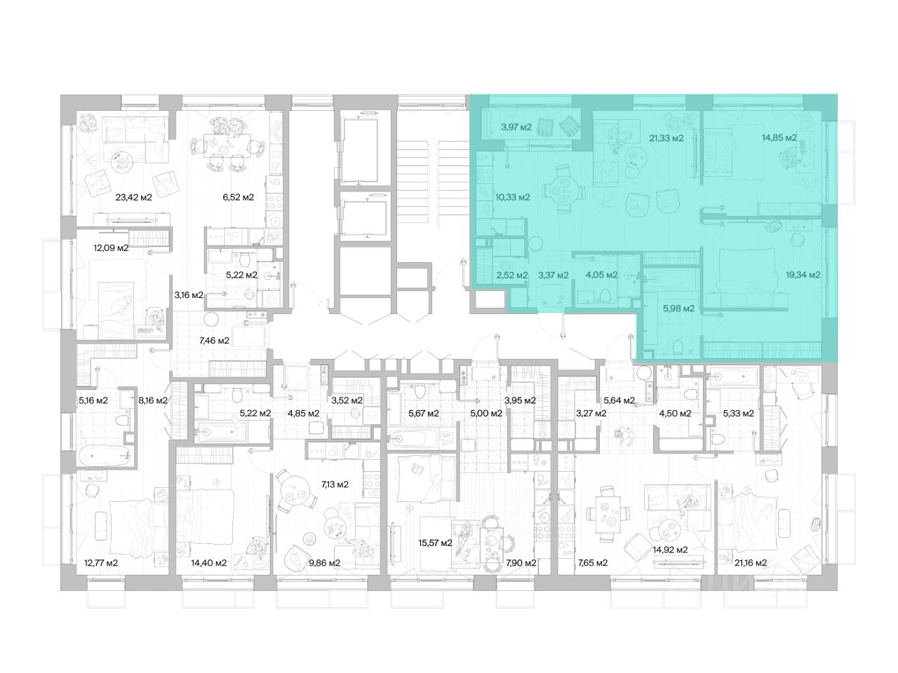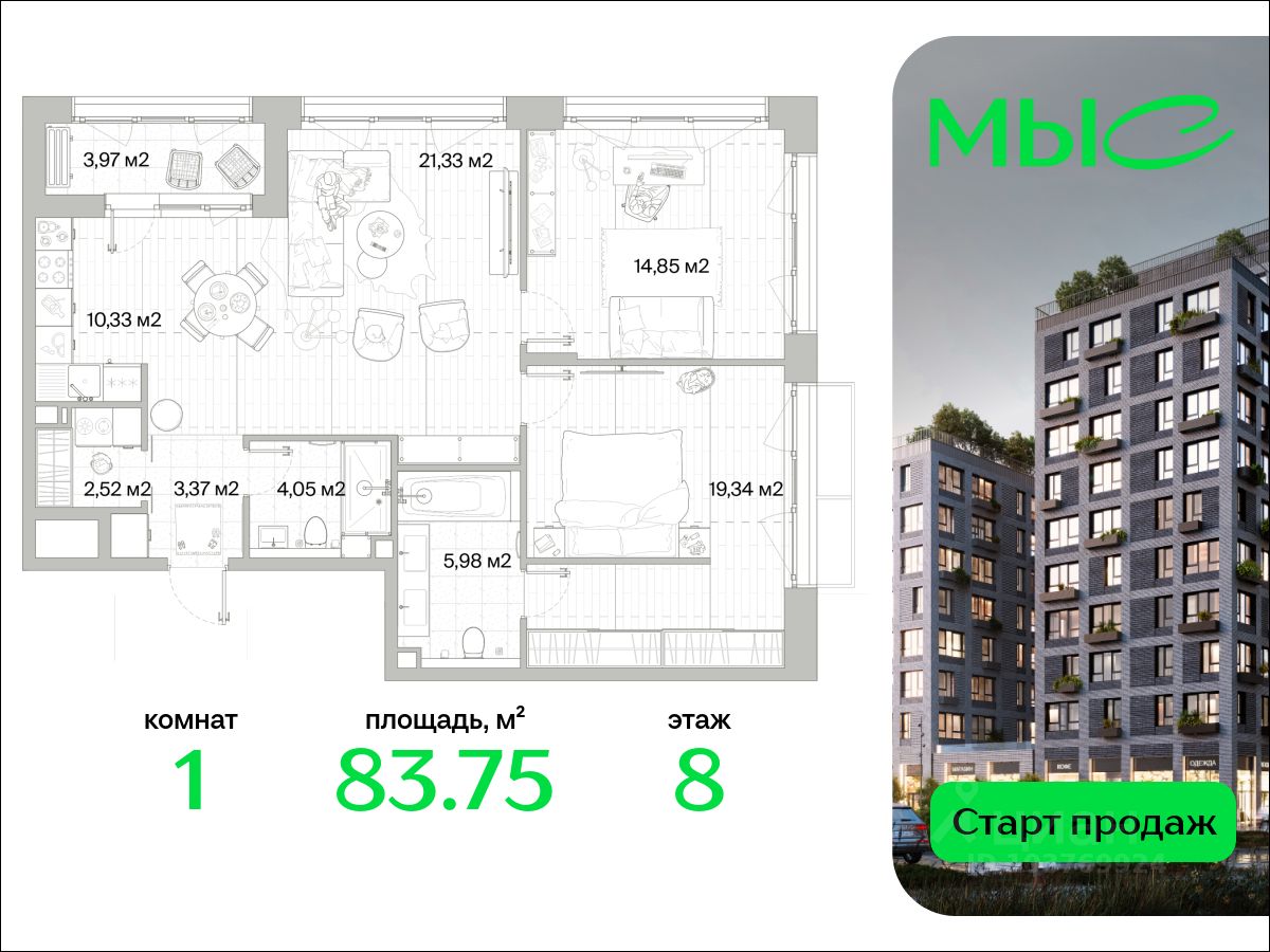 В продаже квартира площадью 83.75 кв. м без отделки на 8 этаже 8 этажного дома. Квартира находится в премиальном жилом комплексе ''МЫС'' (Застройщик - MR Group).