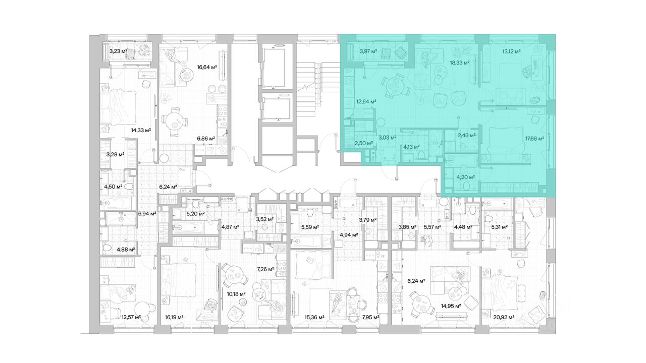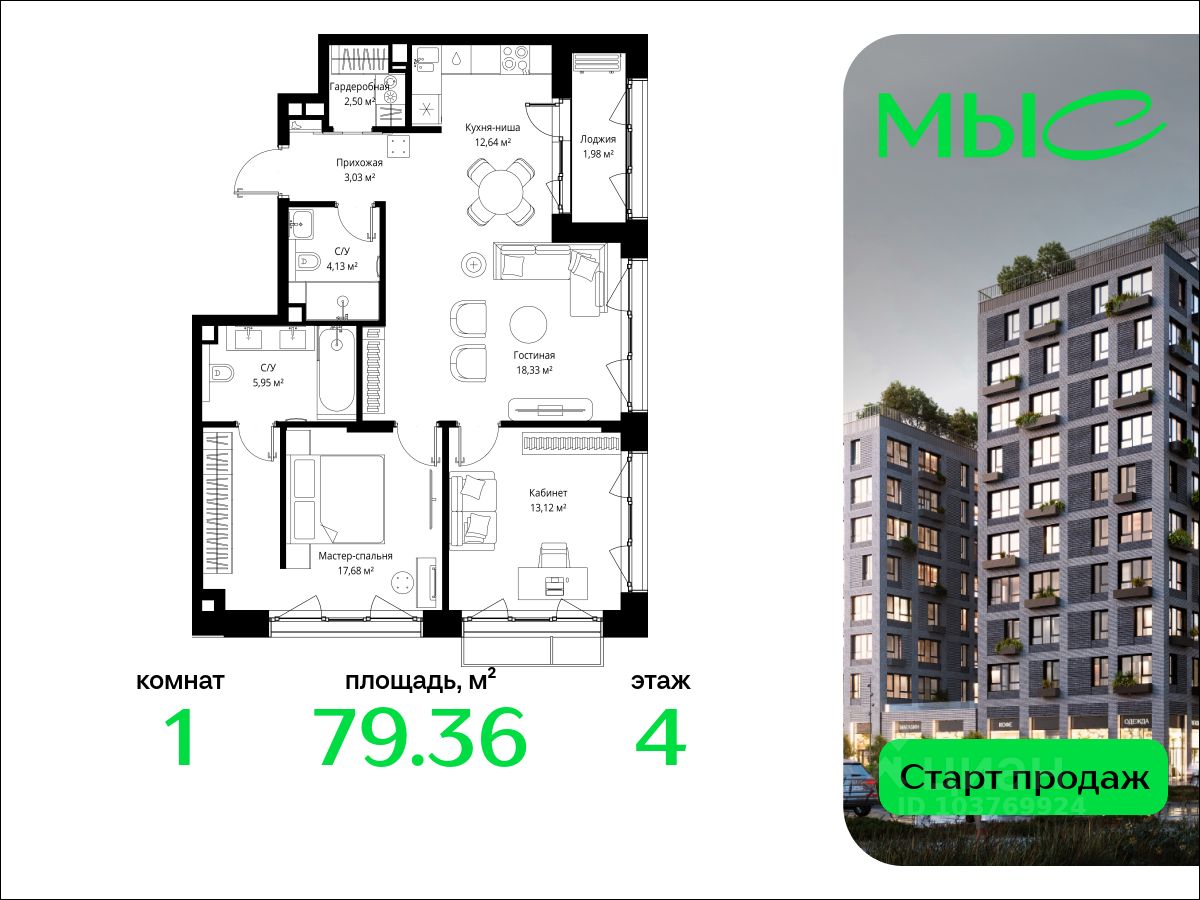 В продаже квартира площадью 79.36 кв. м без отделки на 4 этаже 10 этажного дома. Квартира находится в премиальном жилом комплексе ''МЫС'' (Застройщик - MR Group).