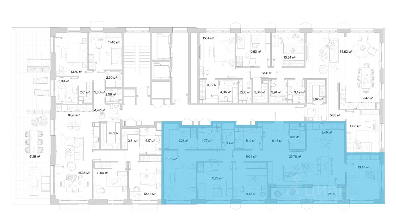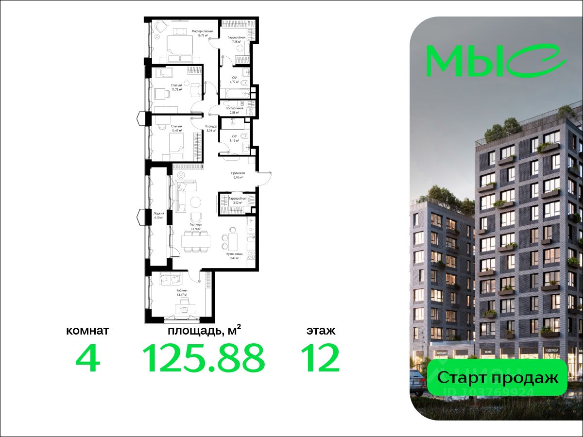 В продаже квартира площадью 125.88 кв. м без отделки на 12 этаже 12 этажного дома. Квартира находится в премиальном жилом комплексе ''МЫС'' (Застройщик - MR Group).