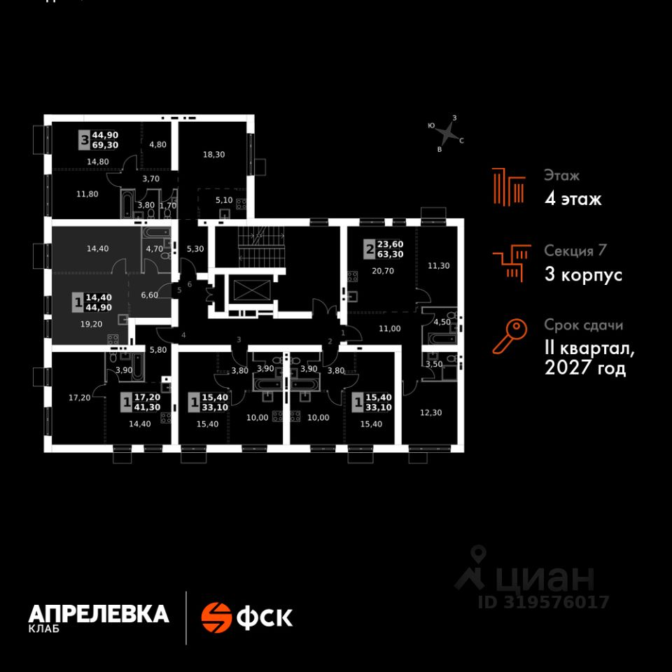 Прямая продажа от застройщика! Загородный жилой комплекс класса Комфорт Плюс. Продаётся 2-к квартира номер 187 общей площадью 44.9 кв.м на 4-м этаже 5 этажного дома. Без отделки.