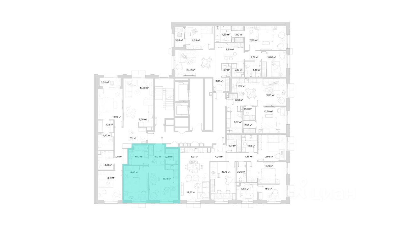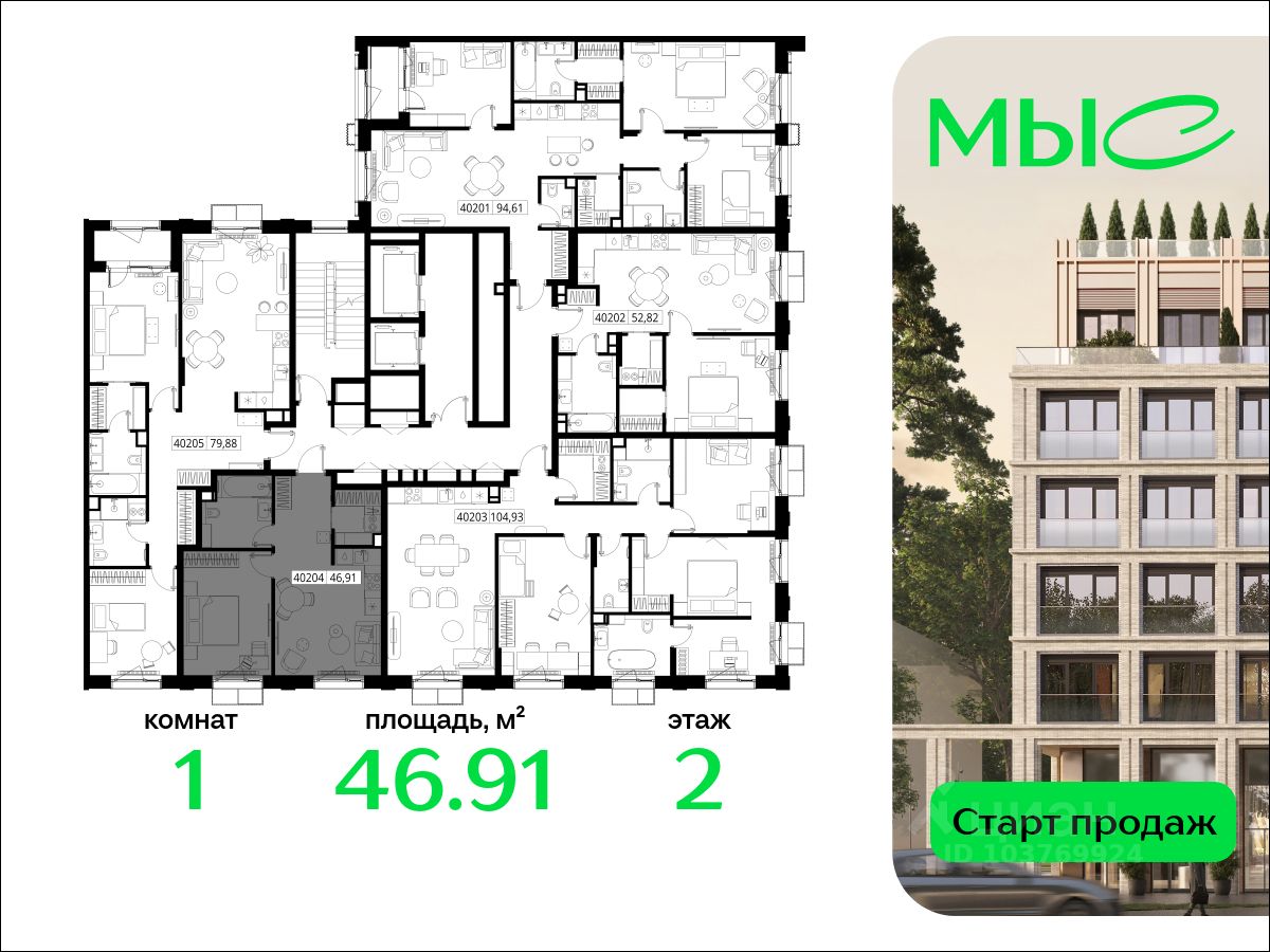 В продаже квартира площадью 46.91 кв. м без отделки на 2 этаже 10 этажного дома. Квартира находится в премиальном жилом комплексе ''МЫС'' (Застройщик - MR Group).