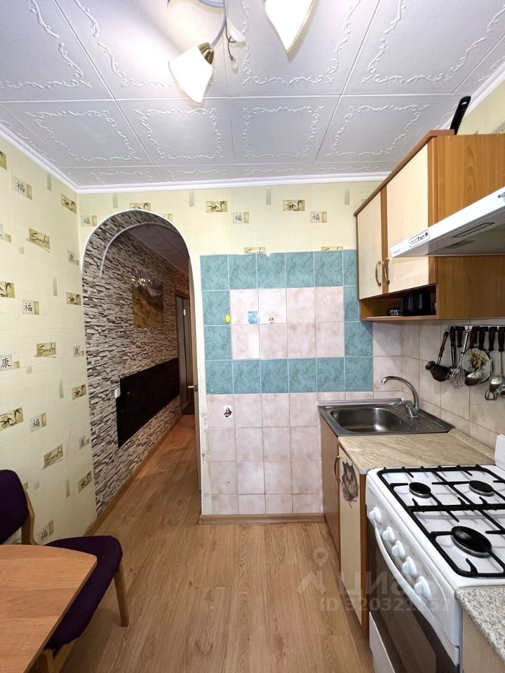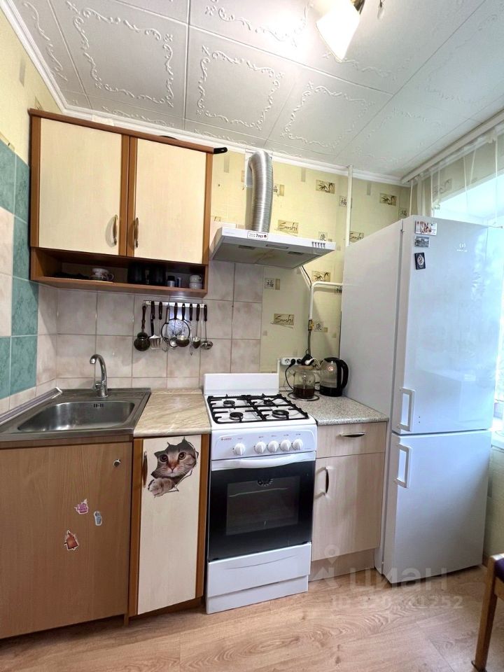 Кухня (5,5 кв.м) несмотря на свои небольшие параметры вмещает все самое необходимое для жизни. На полу ламинат, стены оклеены обоями, на потолке белые панели. Вся мебель и техника остается.