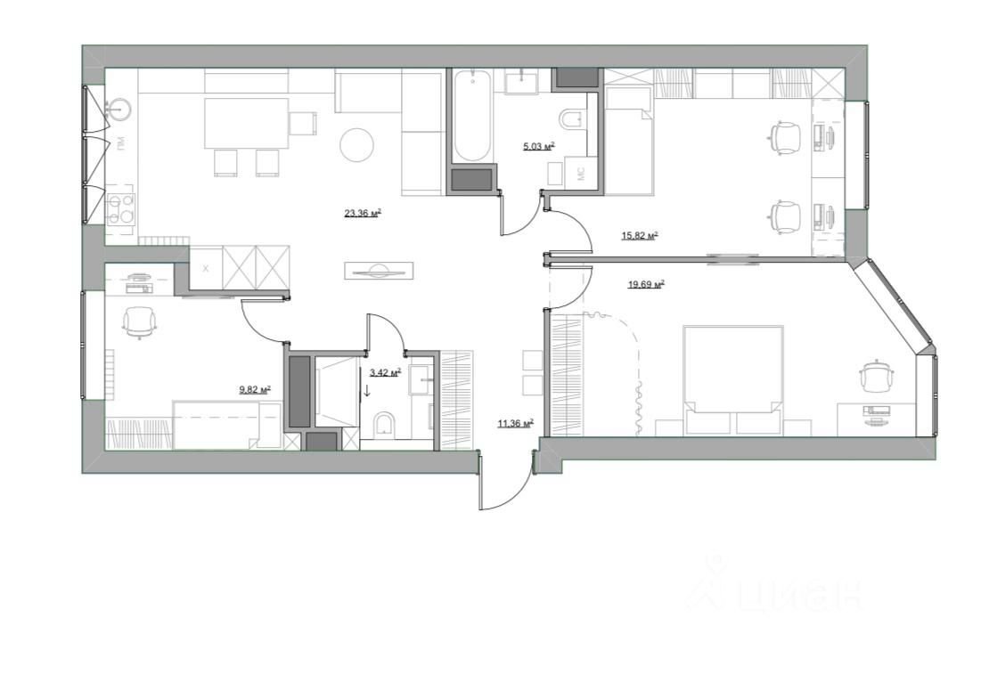 Планировка квартиры просто идеальная: три изолированные комнаты: детская 9,8 м2, детская 15,8 м2 , спальня 19,6 с вместительной гардеробной , стильная кухня - гостиная с комфортной зоной отдыха 23,3 м.2. Два санузла.