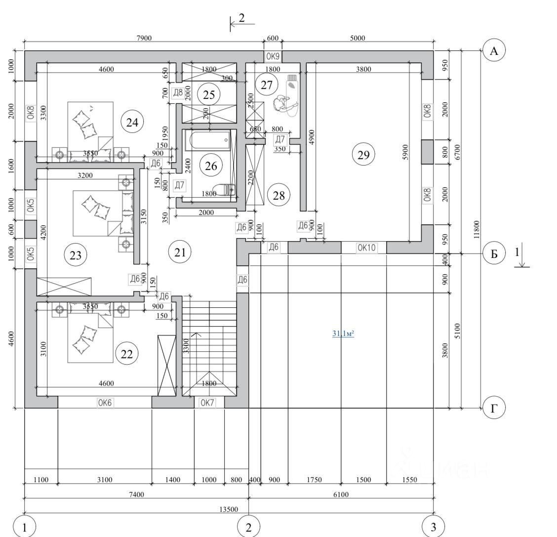 2 этаж: пред - чистовая отделка. Общая площадь 94,3 м. 2 Холл 10,8 м.2 3 спальных комнат - 13,4м2, 14,3м 2, 15,2 м 2, 4 я комната 22,4 м2 свободного назначения с выходом на шикарную террасу с завораживающим видом на лесной массив, которая станет вашим любимым местом для релакса и отдыха на свежем воздухе. Комнату при желании можно обустроить как мастерскую, спортзал. Гардероб 3,6м2. С/у 4,3 м2. Постирочная 4,5 м2. Холл 5,8 м.2. Мини кухня. Высота потолков 3 м.
