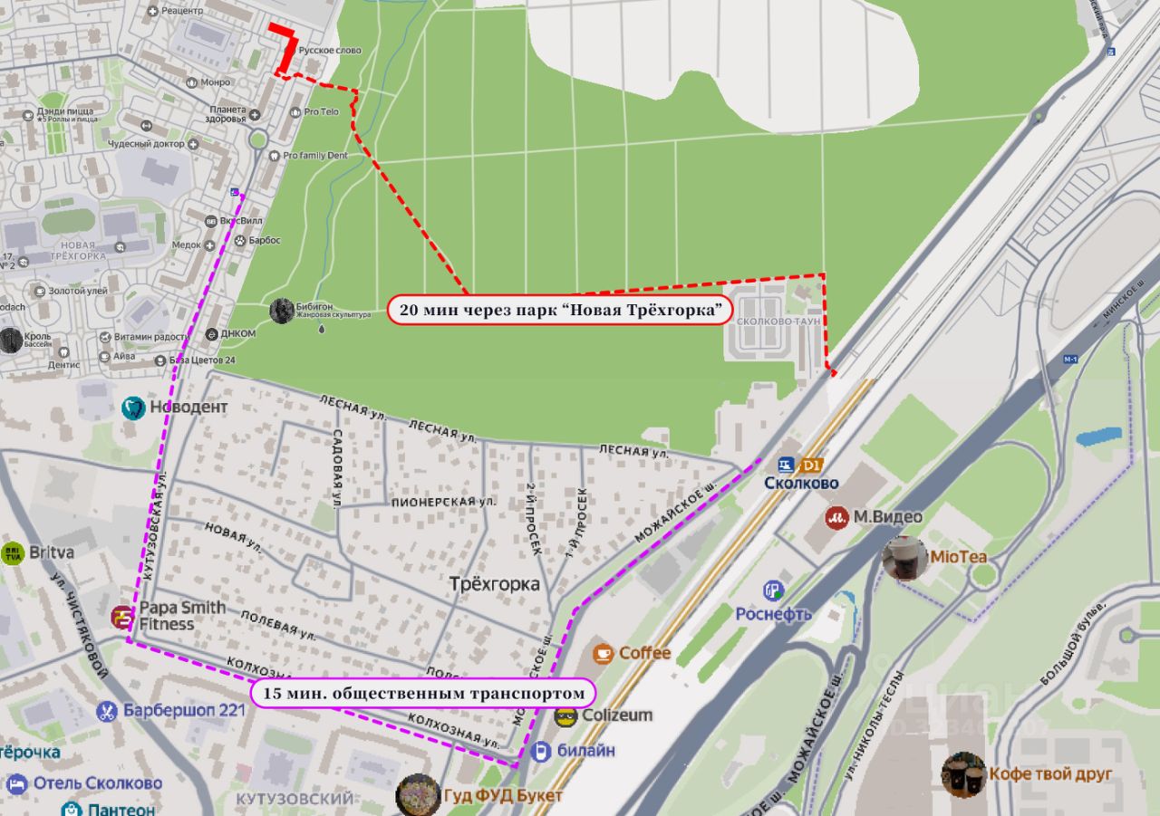 Идеальное расположение: - 20 минут пешком до МЦД Сколково через живописный парк с белками - 8 км до МКАД - быстрый выезд в Москву по платной трассе (около 20 минут до центра утром) - 2 мин. пешком до остановки ''Микрорайон Новая Трёхгорка'' с постоянными маршрутками и автобусами
