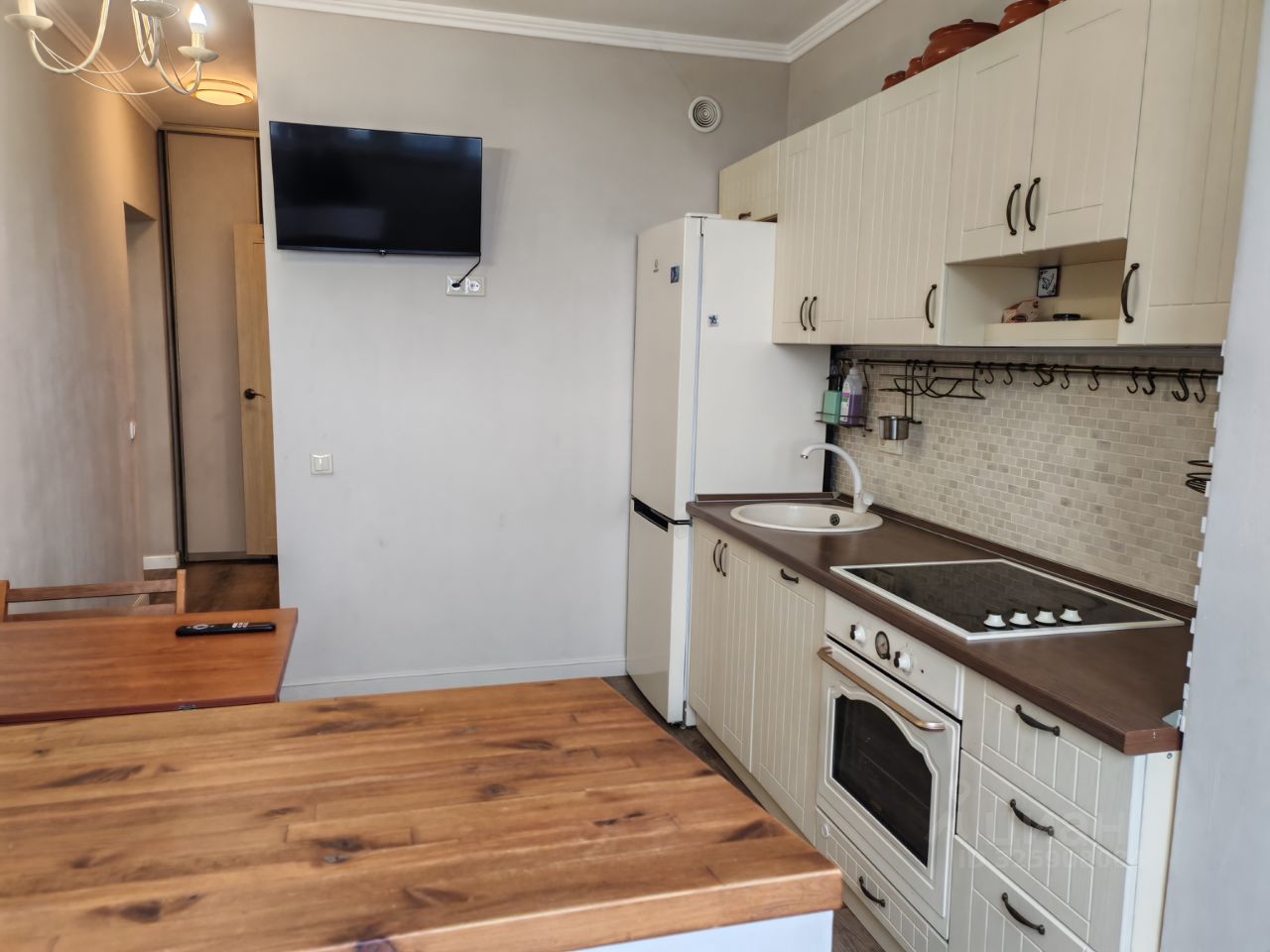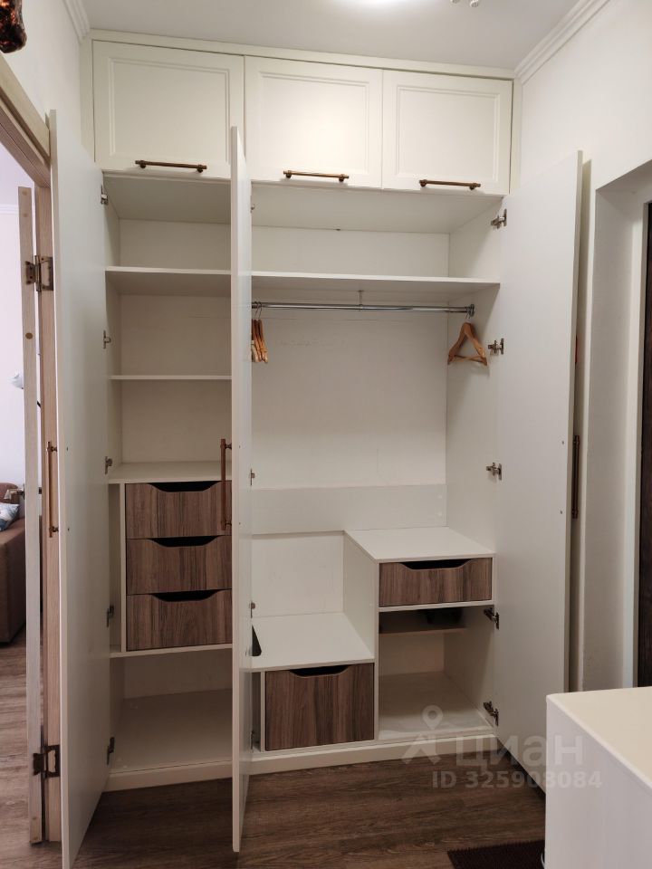 Квартира меблирована и полностью готова для комфортного проживания. В комнате и на кухне есть вся необходимая мебель. Кухня просторная, площадью 10 кв. м, оснащена современной техникой: холодильником, посудомоечной машиной, духовым шкафом, варочной панелью, микроволновкой, а также телевизором. Комната разделена на спальную с полноценной кроватью и гостевую зону с небольшим диваном, есть удобная гардеробная 4 метра.