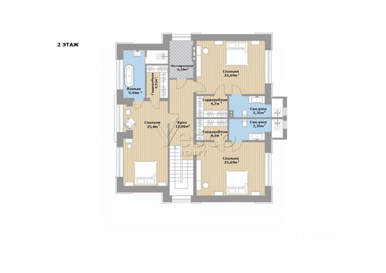 2 этаж: холл, постирочная, спальня 25 кв.м с будуаром с панорамным безрамным окном, ванной комнатой и гардеробной, 2 спальни по 26 кв.м с санузлами и гардеробными.