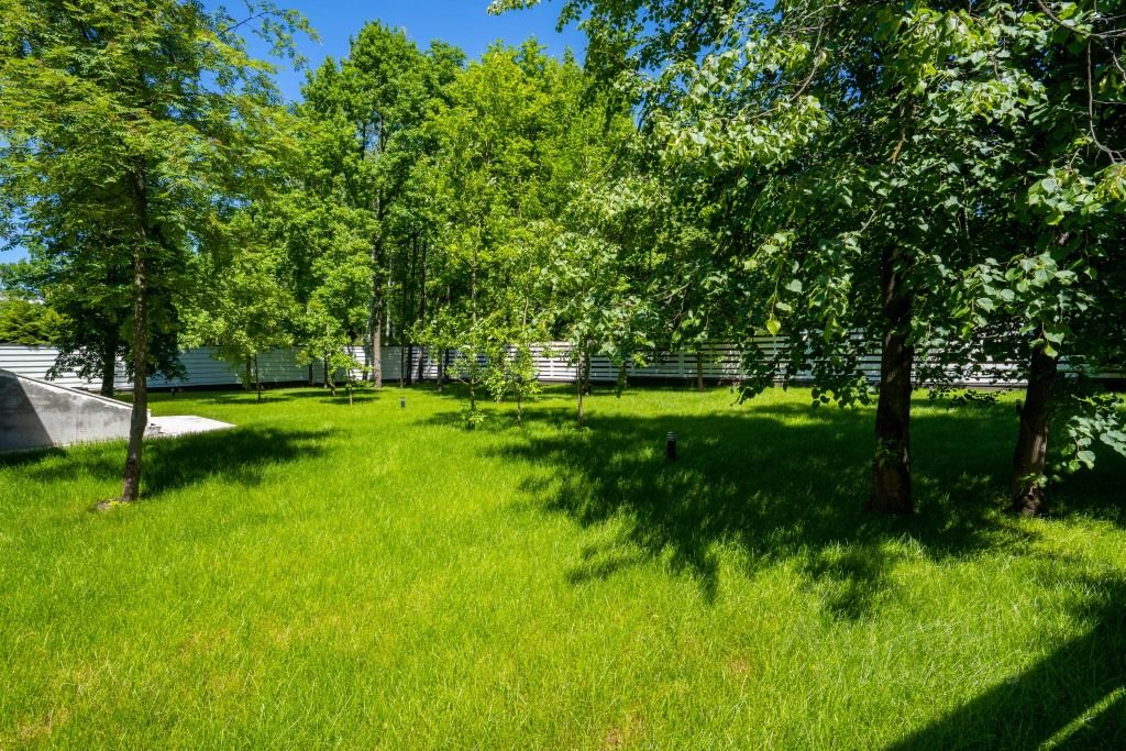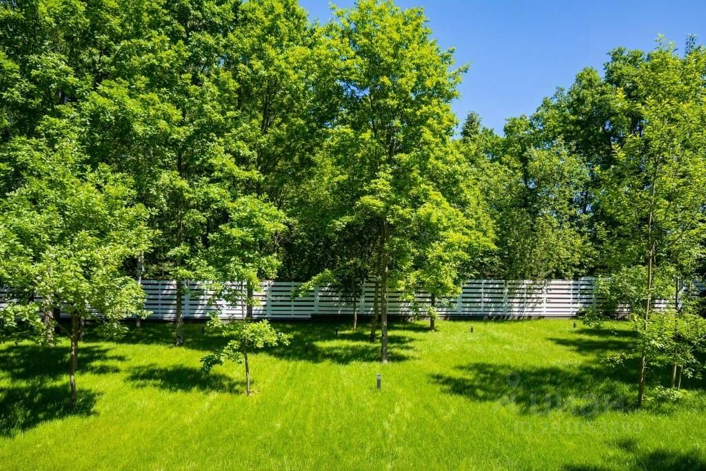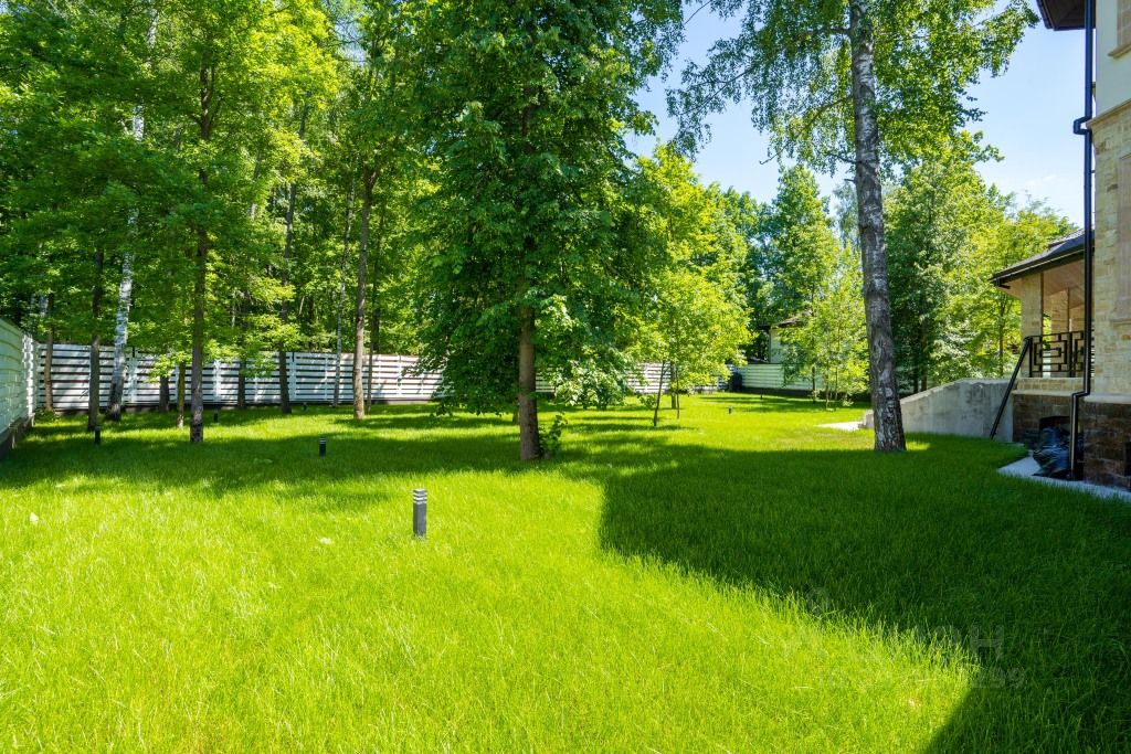 Участок 21 сотка правильной формы с выложенным газоном, автоматическим поливом и освещением, примыкает к лесу, есть возможность увеличения.